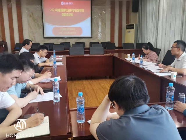 2023年4月19日下午,由成人直播 科研处组织的2023年度国家社科基金项目申报课题论证会在蛟桥园北综合楼815会议室举行,与会人员包括杂志社常务副社长王展祥教授、教务处处长万建香教授两位点评专家以及申报2023年度国家社科基金课题的所有老师。