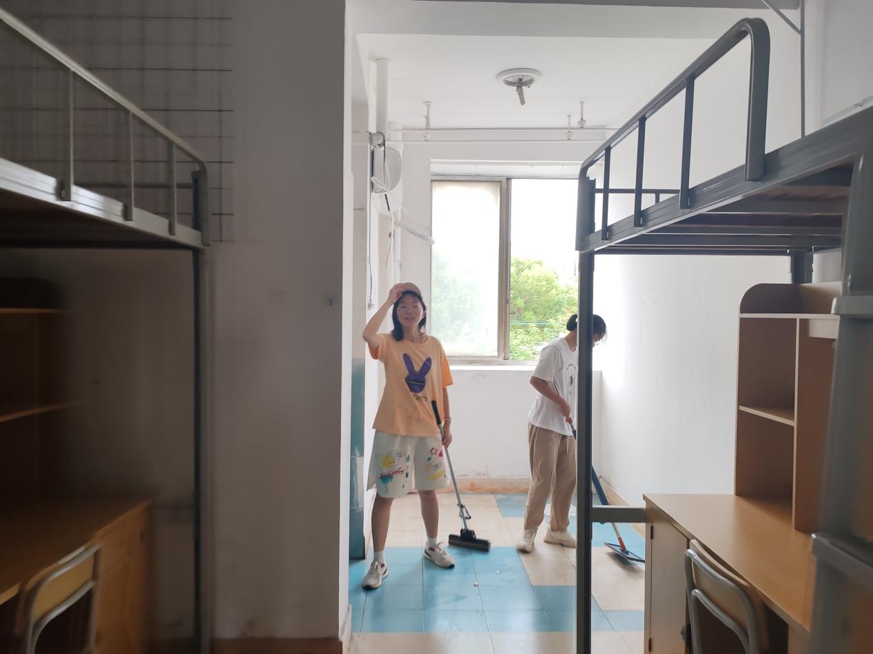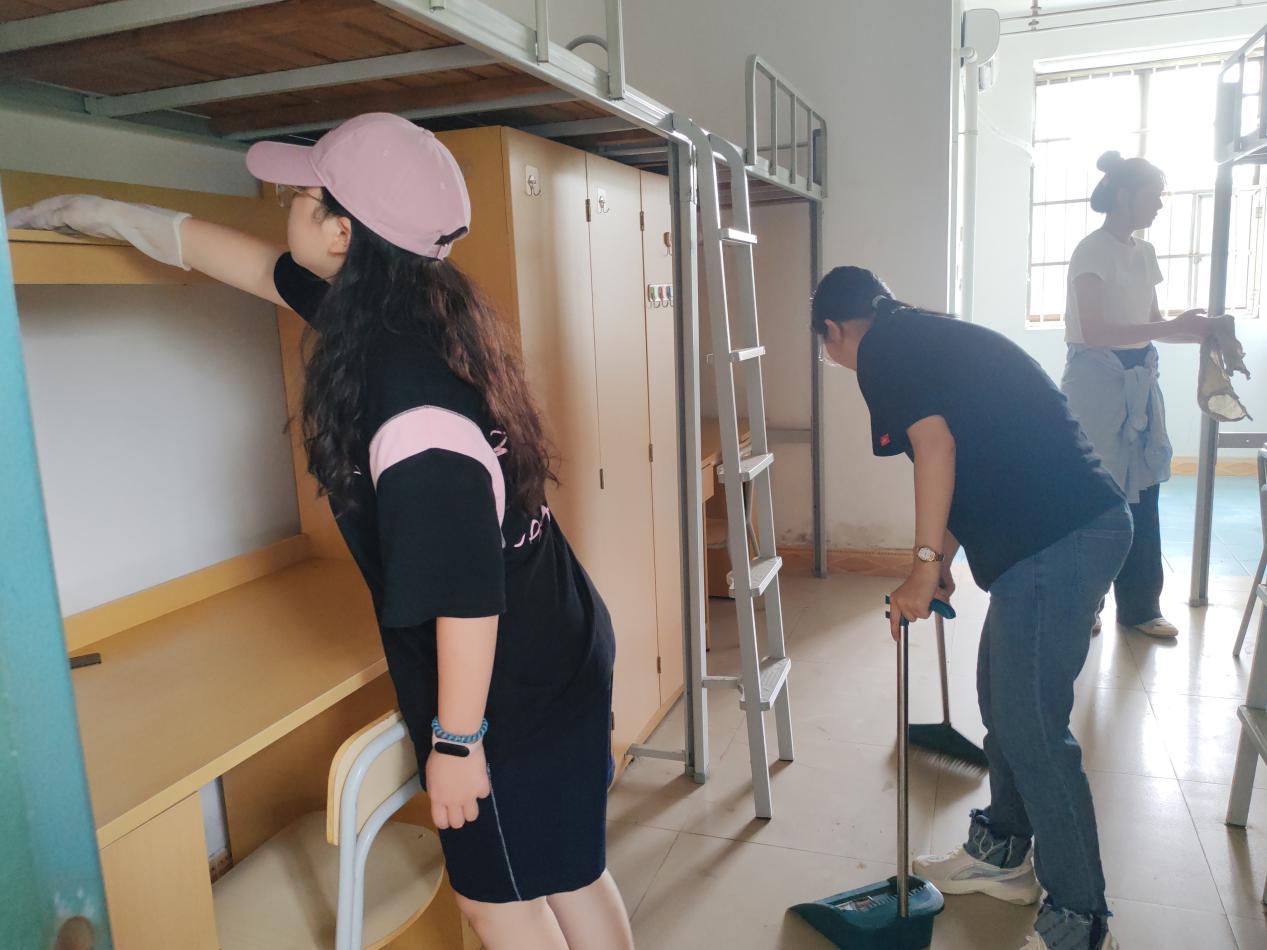 下午两点,志愿者们带上清洁工具,根据安排有序前往各自负责的寝室进行卫生打扫。在打扫过程中,志愿者们分工明确,对桌椅、床板、柜子、阳台、洗手池等逐一进行清洁,不放过任何一个卫生死角、不忽略任何一处角落里的灰尘。志愿者们有条不紊地穿梭在各自负责的寝室进行打扫,一举一动间充满着对新生的爱与关怀。