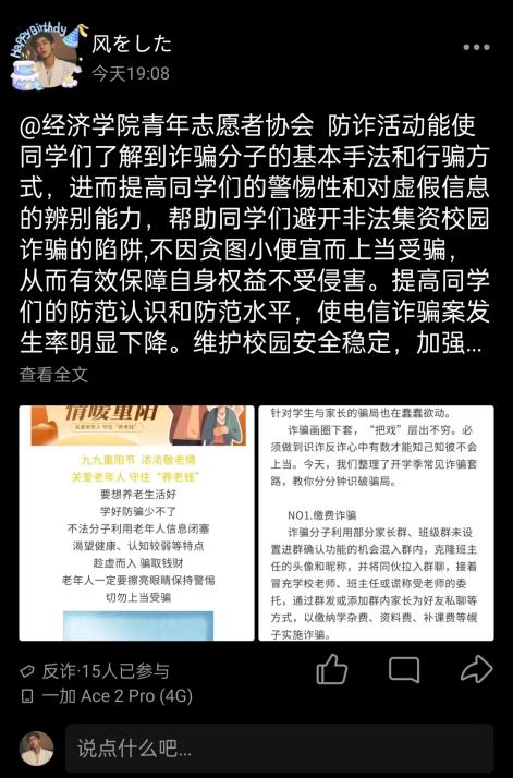 在活动进行时,志愿者们还添加了防诈知识问答环节,并组织同学们在防诈横幅上签字,以进一步增强同学们的反诈意识。此外,本次活动还设置了抽奖箱,完成活动内容的同学们可参与抽奖,获得精美礼品。此次活动得到了广大学生的积极响应,大家纷纷表示,通过此次活动,提高了自己的防范意识和能力,受益匪浅。