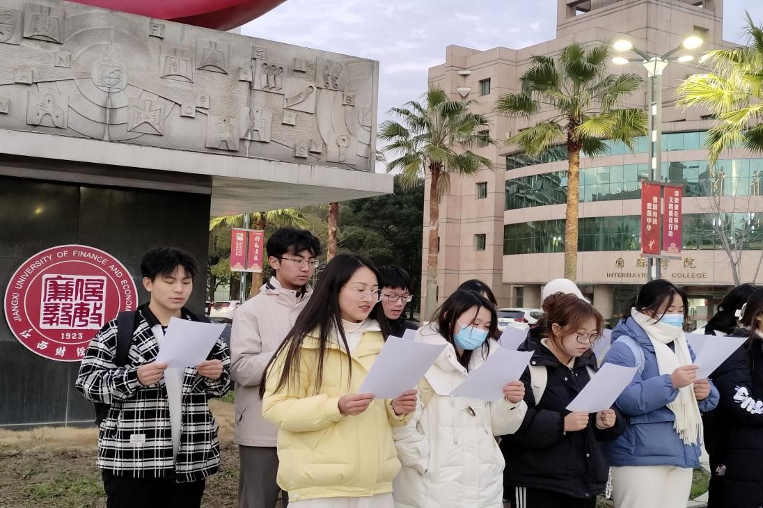 活动展开当⽇,⻘年志愿者协会成员提前五分钟到达崛起⼴场并有序集合,由活动负责⼈排列队形并发放⽑泽东诗词的纸质稿。在活动展开前,活动负责⼈向同学们说明本次活动的正式性、严肃性以及其对待个⼈和社会的重要意义,确保了本次活动顺利开展。