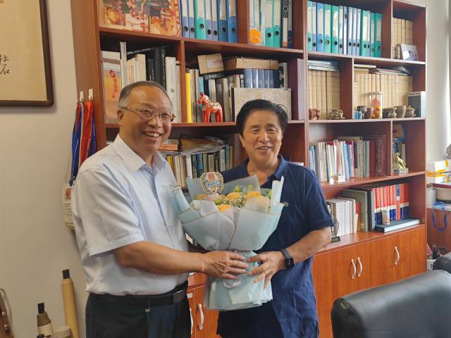 阙善栋首先看望了王小平教授,关切地询问他的生活工作和身体状况,对他为学校发展付出的辛勤劳动表示感谢,介绍了学校近期取得的成绩,希望能一如既往地关心和支持学校事业发展。王小平教授介绍了自己近期工作,以及指导青年教师和研究生培养情况,并为学校发展建言献策。