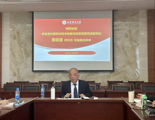 10月24日下午,农业农村部农村经济体制与经营管理司原副司长黄延信研究员受邀莅临成人直播 讲学,作了以“深化农村改革若干问题”为主题的学术报告,讲座由生态经济研究院院长潘丹教授主持,院长张利国、中国农业农村现代化研究院院长周应恒教授等院内外50余师生参加。