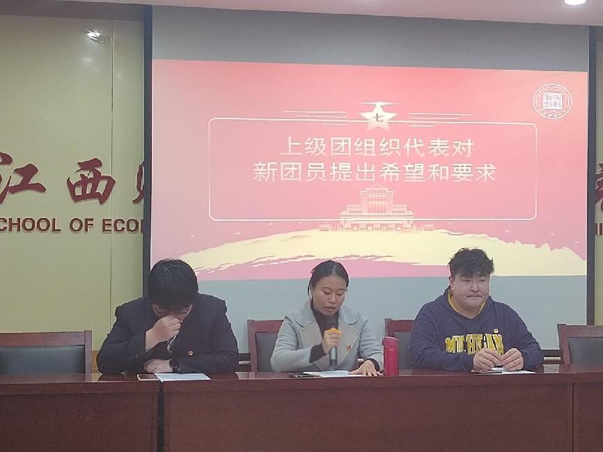 万婧怡老师代表学院团委向光荣加入团组织的各位新团员致以诚挚的祝贺。她指出,近年来我院团委在校团委和院党委的的坚强领导下,积极开展了丰富的学习、实践活动,涌现出江西省青年五四奖章1人,江西省青年讲师1人,江西省优秀共青团员2人等优秀个人,为广大同学树立了榜样。她希望心团员们胸怀大志笃信笃行,争做有理想的新时代好青年;披荆斩棘勇担挑战,争做敢担当的新时代好青年;默默无闻服务社会,争做能吃苦的新时代好青年;脚踏实地敢拼敢为,争做肯奋斗的新时代好青年。不负时代,不负韶华。