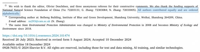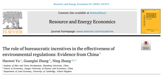 2024年12月,张广来老师以共同第一作者(文中按作者姓氏排序为第二顺序作者)在能源与环境经济学顶级期刊Resource and Energy Economics发表题为《The role of bureaucratic incentives in the effectiveness of environmental regulations: Evidence from China》的研究成果,揭示官员动机对环境政策有效性的影响。Resource and Energy Economics(经济学SSCI一区期刊)是资源环境经济领域国际权威期刊。