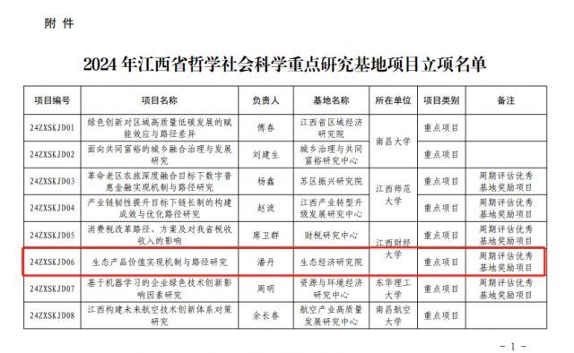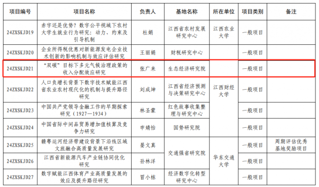 成人直播 潘丹教授申报的《生态产品价值实现机制与路径研究》立项为江西省哲学社会科学重点研究基地重点项目,张广来博士申报的《“双碳”目标下多元气候治理政策的收入分配效应研究》立项为江西省哲学社会科学重点研究基地一般项目。