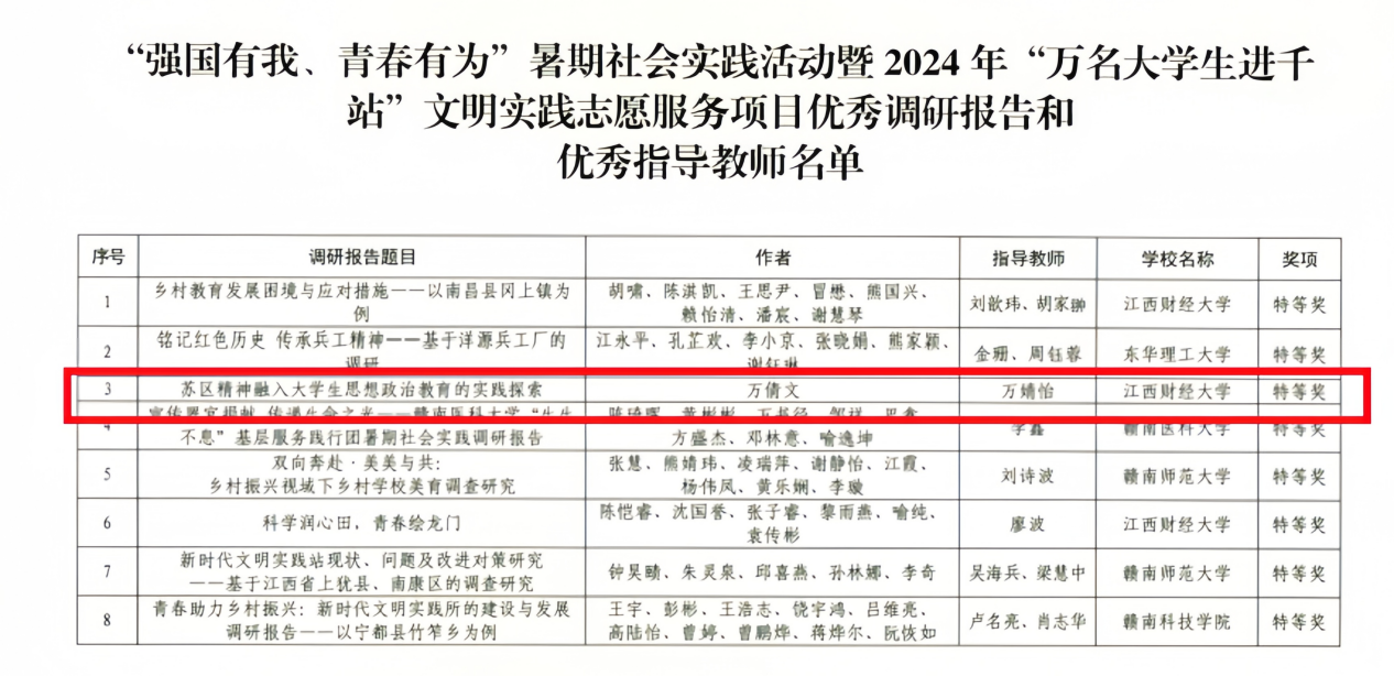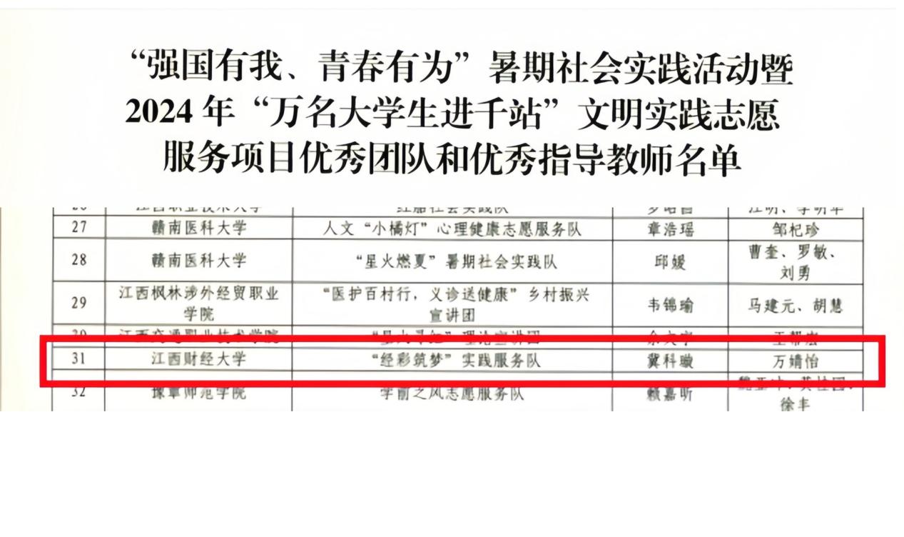 “强国有我,青春有为”暑期社会实践活动暨2024年“万名大学生进千站”文明实践志愿服务项目评选工作已落下帷幕,此次活动由江西省教育厅主办,旨在为青年学生提供实践锻炼的机会,为基层社会发展和文明建设注入青春力量。通过实践活动,青年学生能够更好地将个人成长与国家发展紧密结合,为实现中华民族伟大复兴贡献智慧和力量。在成人直播 师生的共同努力下,成人直播 在此次活动中荣获省级优秀调研报告、省级优秀指导教师、省级优秀团队三项荣誉称号,展现了经院师生的风采和实力。