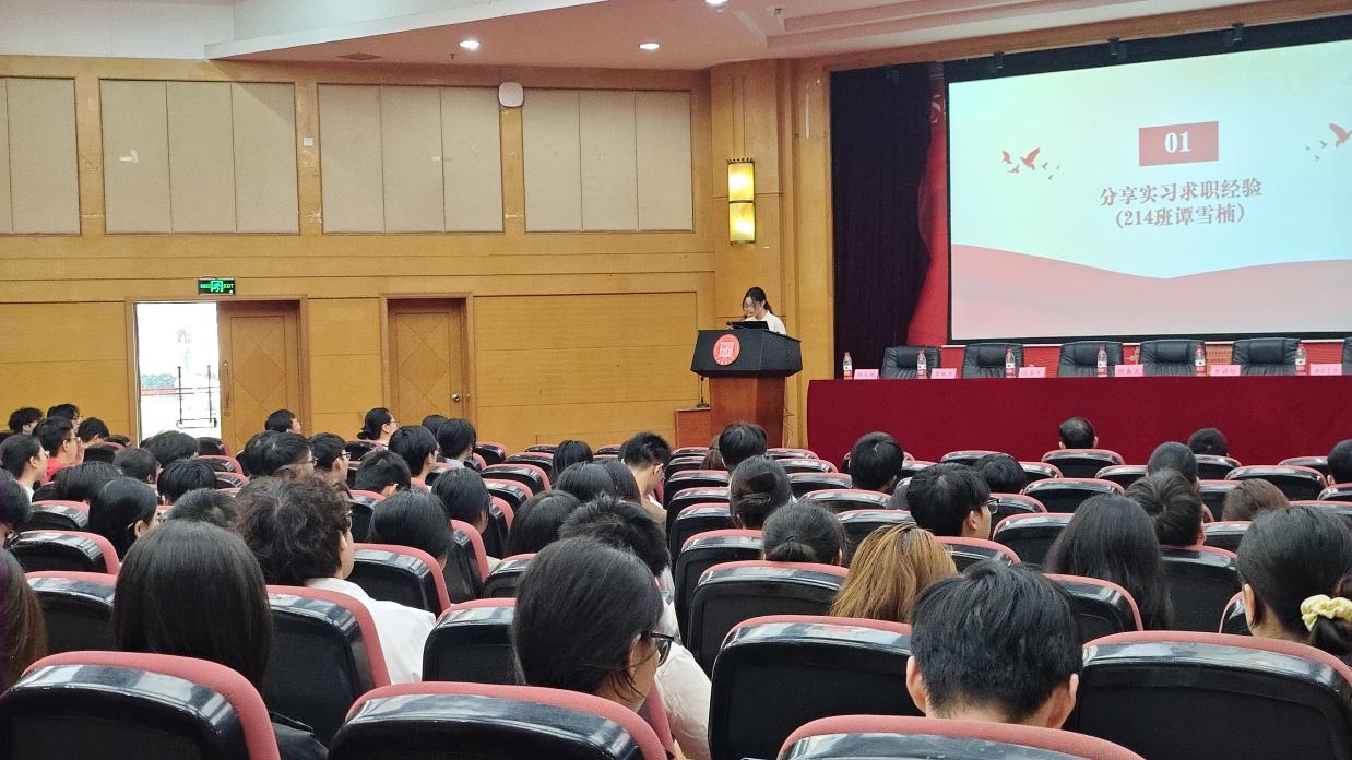 为了让学生获得更贴近实战的经验,大会特别邀请了2025届优秀毕业生代表214班谭雪楠进行实习与求职经验分享。她结合自身经历,分享了实用的实习信息获取渠道、有效的简历制作、关键的面试心得以及实习对求职的重要影响等方面的内容。