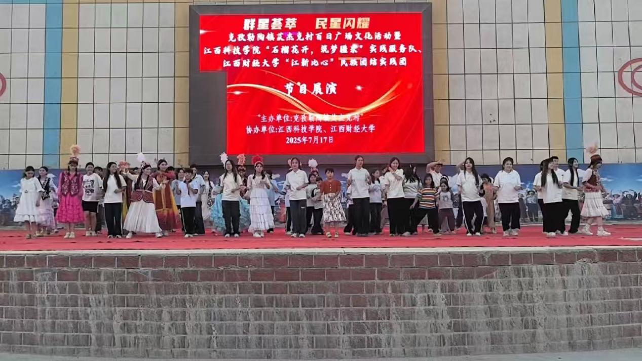 7月17日晚,由阿克陶县克孜勒陶镇艾杰克村村委会主办、成人直播 “江新比心”民族团结实践团与江西科技学院“石榴花开 筑梦疆来”实践服务队联合承办的“百日广场文化活动——群星荟萃,民星闪耀”联欢会在丝路佳苑文化广场上演。江财“江新比心”民族团结实践团以歌声与舞步为媒,与克孜勒陶镇丝路佳苑小学的少先队员们共同献上了一场跨越地域的青春对话。