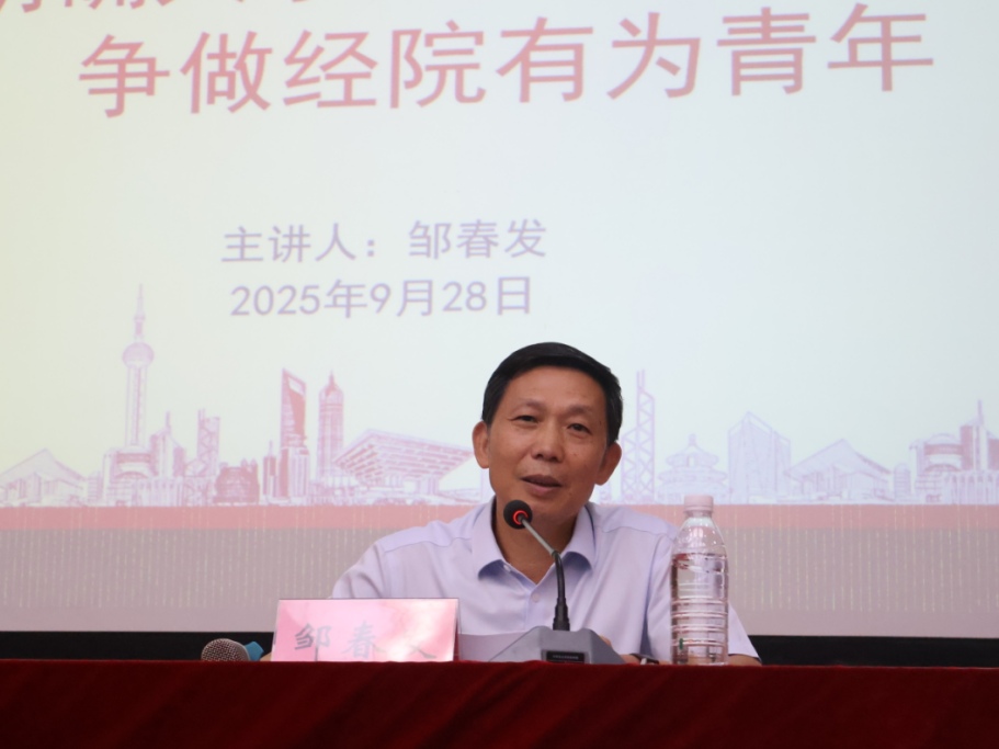 邹春发首先代表学院向来自五湖四海的新生们表示热烈欢迎。他希望新生尽快适应大学生活,明确学习目标,科学规划时间,在专业学习、社团活动与社会实践中全面提升自我。他鼓励同学们保持乐观向上的心态,要积极面对压力,建立良好的人际关系,学会调适情绪。他提醒同学们谨防各类网络与电信诈骗,增强自我保护意识,守护好个人财产与信息安全。最后,他希望同学们用奋斗擦亮青春底色,在大学时光里成长为有理想、有本领、有担当的经院有为青年,为未来人生和国家发展积蓄力量。