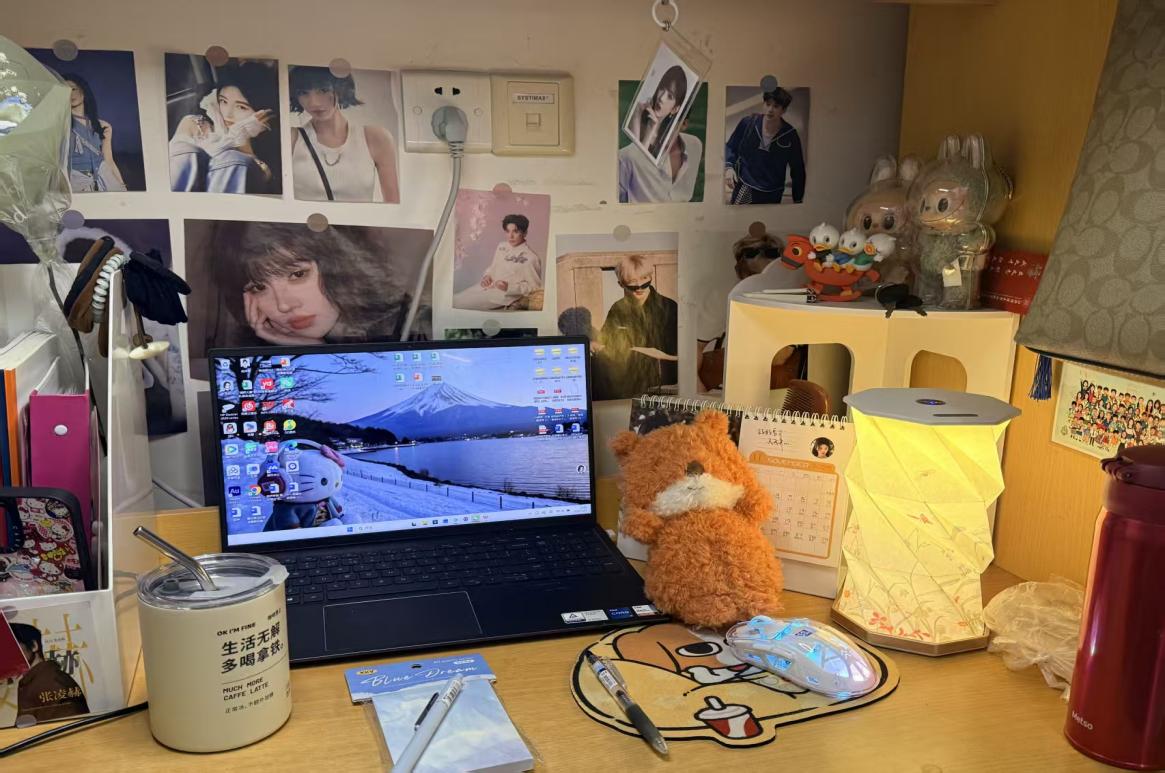 照片墙缀着心动瞬间,小狐狸玩偶倚着亮着富士山壁纸的电脑,“生活无解多喝拿铁”的杯子冒着暖意——这方书桌,把细碎的喜欢揉进日常:暖灯晕开软黄,摆件藏着雀跃,连鼠标垫都裹着甜意。推门是烟火,抬眼是欢喜,青春的温柔,本就该是22A222的这般模样。